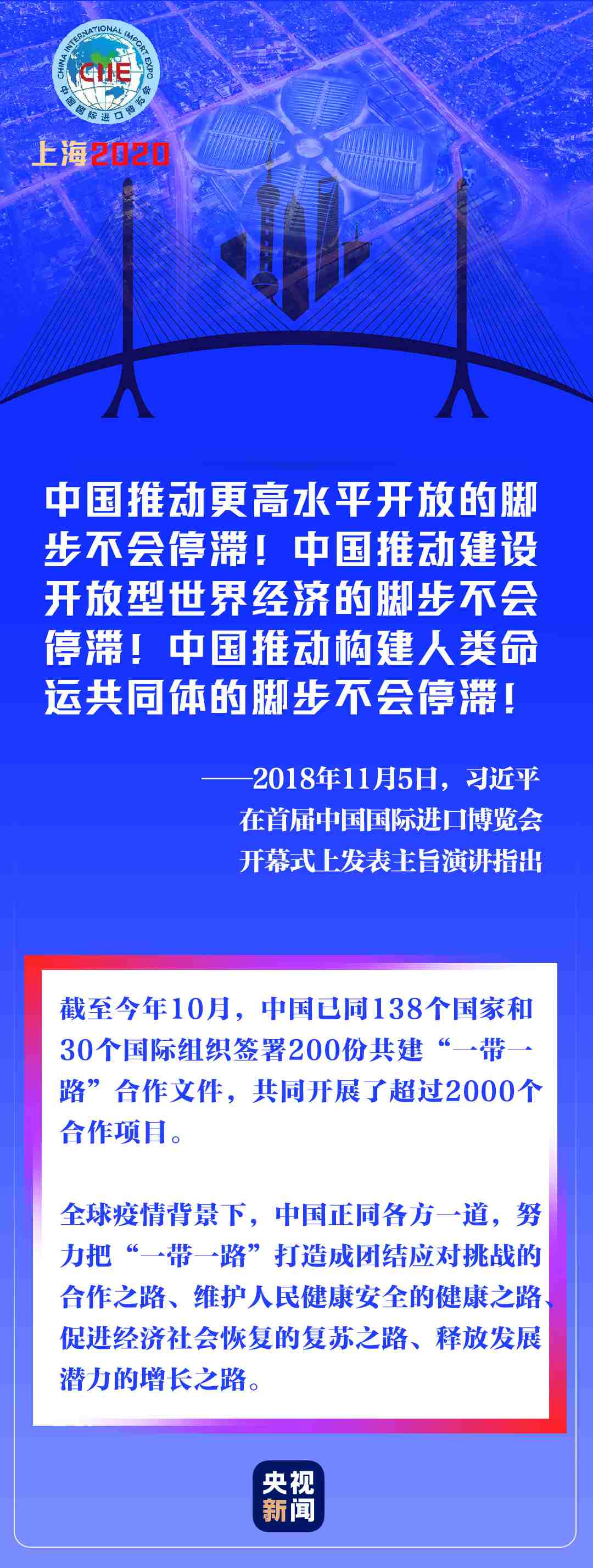 在新冠肺炎疫情全球蔓延、世界經濟持續(xù)低迷的非常時期,進博會如期而至,為世界各國各地區(qū)搭建通往更多市場機遇、投資機遇、增長機遇的橋梁。
