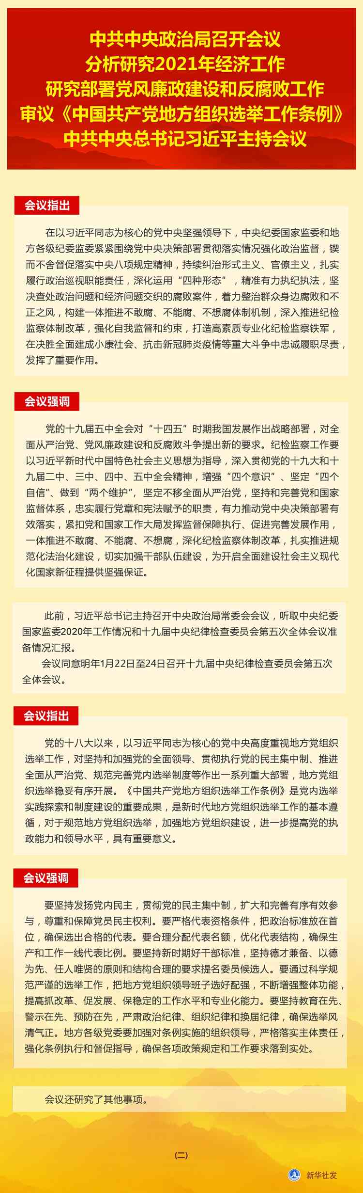 新華社北京12月11日電 中共中央政治局12月11日召開(kāi)會(huì)議,分析研究2021年經(jīng)濟(jì)工作;聽(tīng)取中央紀(jì)委國(guó)家監(jiān)委工作匯報(bào),研究部署2021年黨風(fēng)廉政建設(shè)和反腐敗工作;審議《中國(guó)共產(chǎn)黨地方組織選舉工作條例》。中共中央總書(shū)記習(xí)近平主持會(huì)議。