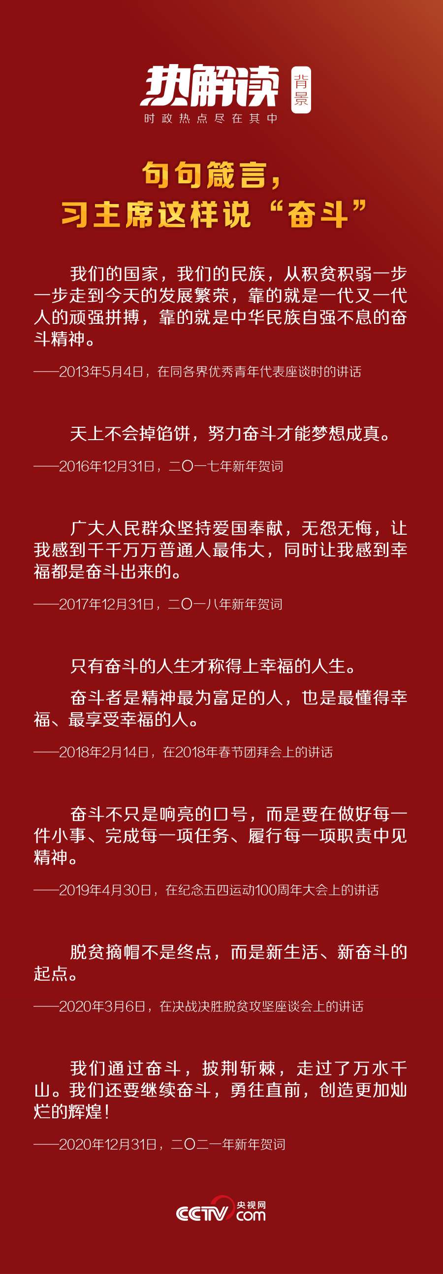 2020年,“十三五”圓滿收官,“十四五”全面擘畫;2021年,既是“十四五”開局之年,又是“兩個一百年”的歷史交匯點,全面建設社會主義現(xiàn)代化國家新征程即將開啟。在這個關鍵節(jié)點再次強調“奮斗”,習近平主席意蘊深遠。