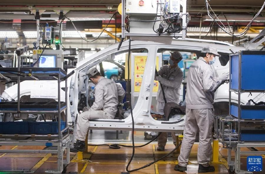 2020年3月24日,工人在湖北武漢東風乘用車公司工廠總裝車間的流水線上作業(yè)。2020年3月下旬左右,武漢各企業(yè)開始陸續(xù)復工復產(chǎn)。新華社記者 肖藝九