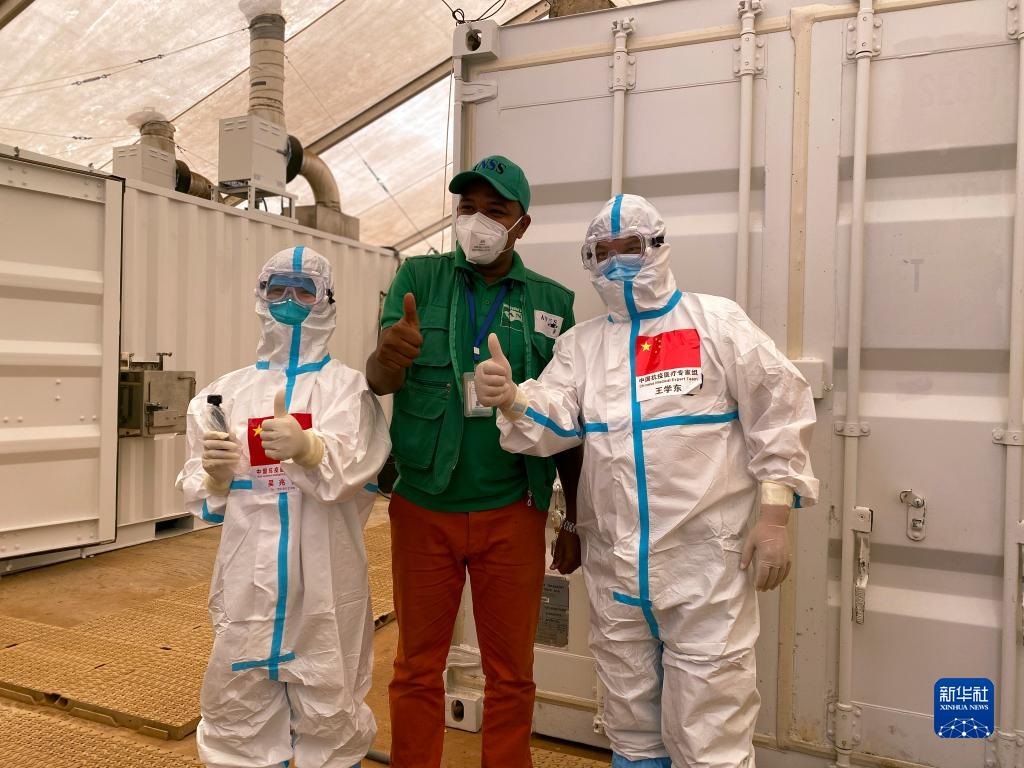 2020年9月2日,在幾內(nèi)亞首都科納克里一個(gè)核酸檢測取樣點(diǎn),中國抗疫醫(yī)療專家組成員與當(dāng)?shù)毓ぷ魅藛T合影。新華社發(fā)(專家組供圖)