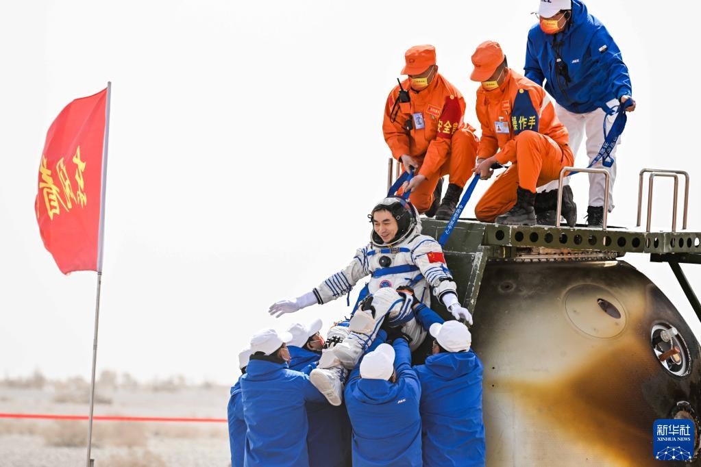 4月16日,神舟十三號(hào)載人飛船返回艙在東風(fēng)著陸場(chǎng)成功著陸。這是航天員葉光富安全順利出艙。新華社記者 連振 攝