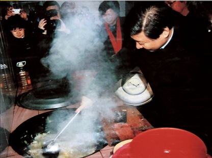 2007年1月,時(shí)任浙江省委書記習(xí)近平(右一)在浙江省慶元縣屏都鎮(zhèn)敬老院為老人們炒菜。新華社發(fā)