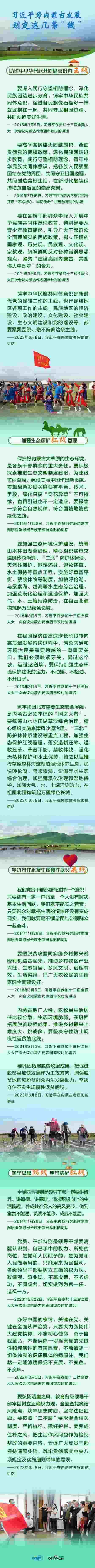 6月8日,習(xí)近平總書記聽取內(nèi)蒙古自治區(qū)黨委和政府工作匯報后發(fā)表講話,強調(diào)內(nèi)蒙古要“以鑄牢中華民族共同體意識為主線”,“加強生態(tài)保護(hù)紅線管理”,“堅決守住不發(fā)生規(guī)模性返貧底線”,“筑牢思想防線,堅守法紀(jì)紅線”。