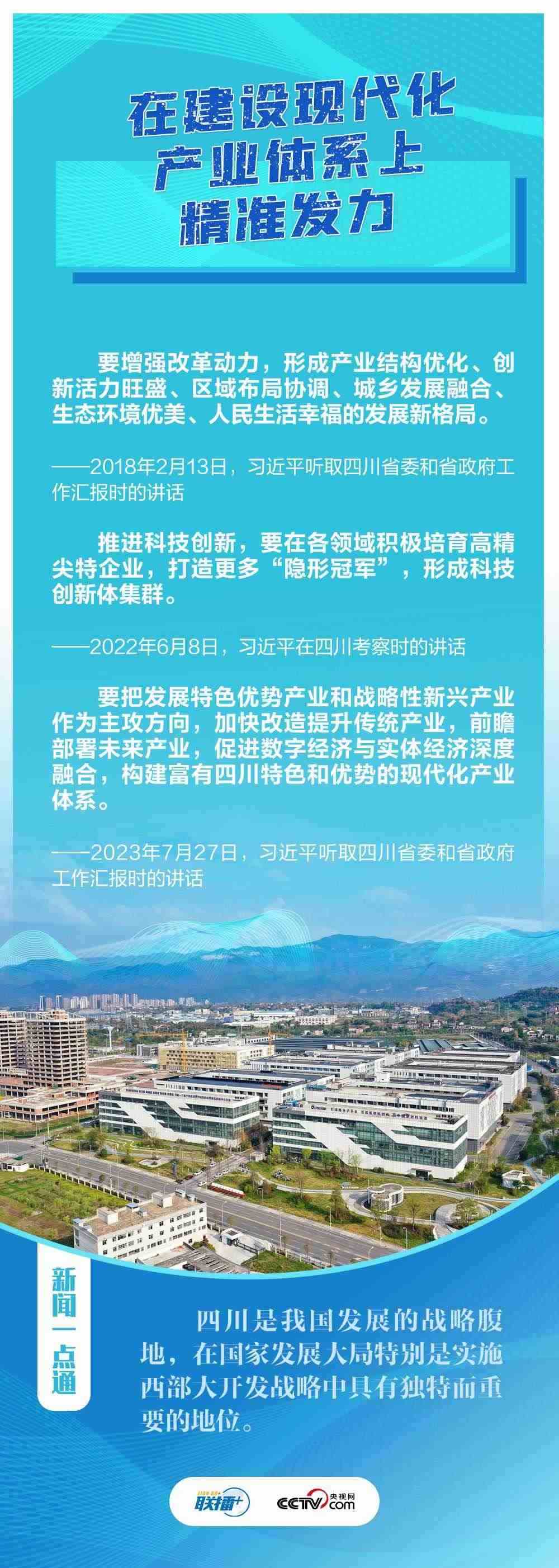 “希望四川在推進(jìn)科技創(chuàng)新和科技成果轉(zhuǎn)化上同時(shí)發(fā)力,在建設(shè)現(xiàn)代化產(chǎn)業(yè)體系上精準(zhǔn)發(fā)力,在推進(jìn)鄉(xiāng)村振興上全面發(fā)力,在筑牢長(zhǎng)江黃河上游生態(tài)屏障上持續(xù)發(fā)力?!?月27日,在巴蜀大地考察的習(xí)近平總書記聽取四川省委和省政府工作匯報(bào),對(duì)四川各項(xiàng)工作提出新寄望。