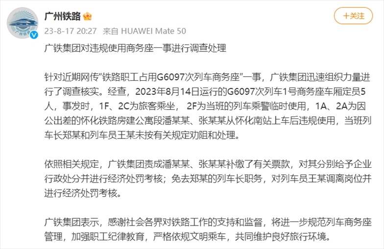 ·廣鐵集團(tuán)回應(yīng)職工占用高鐵商務(wù)座:2人補(bǔ)繳車(chē)票,列車(chē)長(zhǎng)免職。