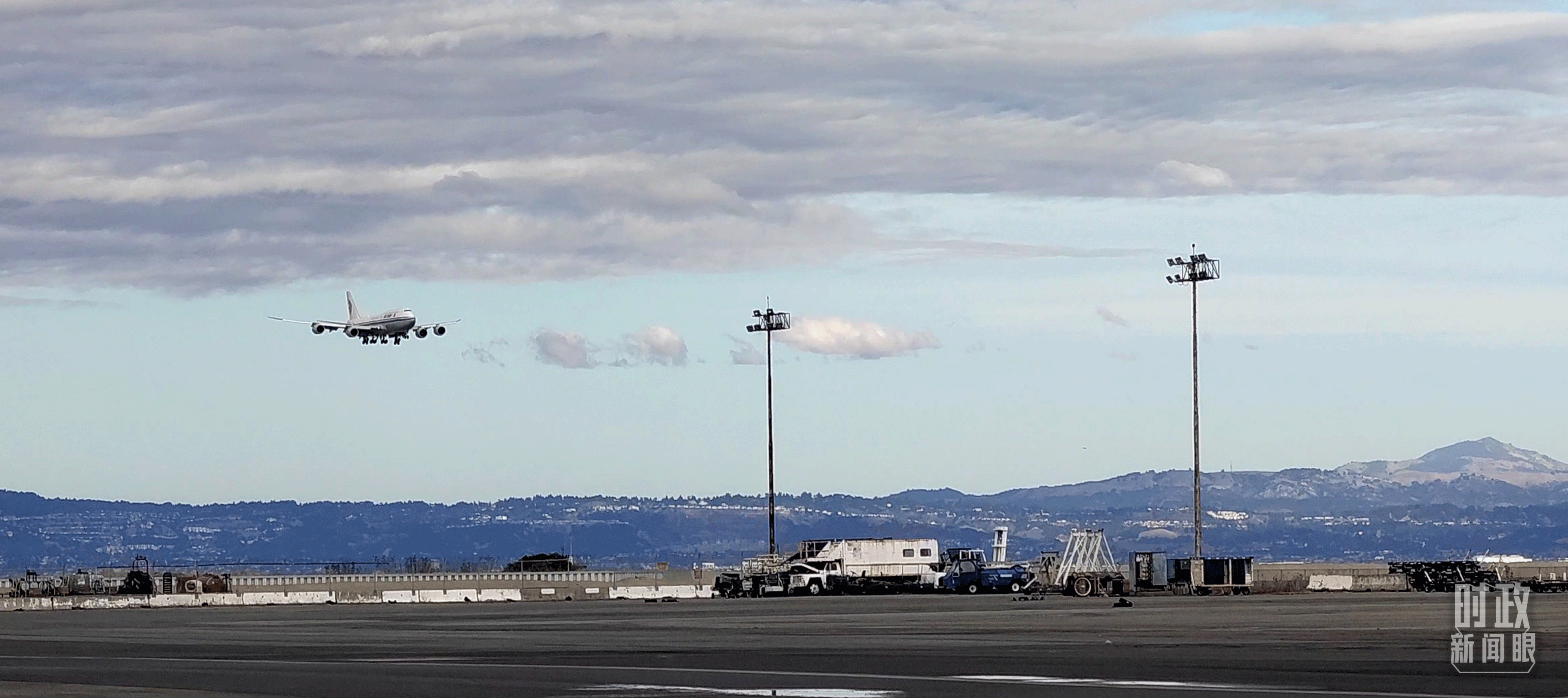 △習近平乘坐的專機即將降落舊金山國際機場。(總臺央視記者張曉鵬拍攝)