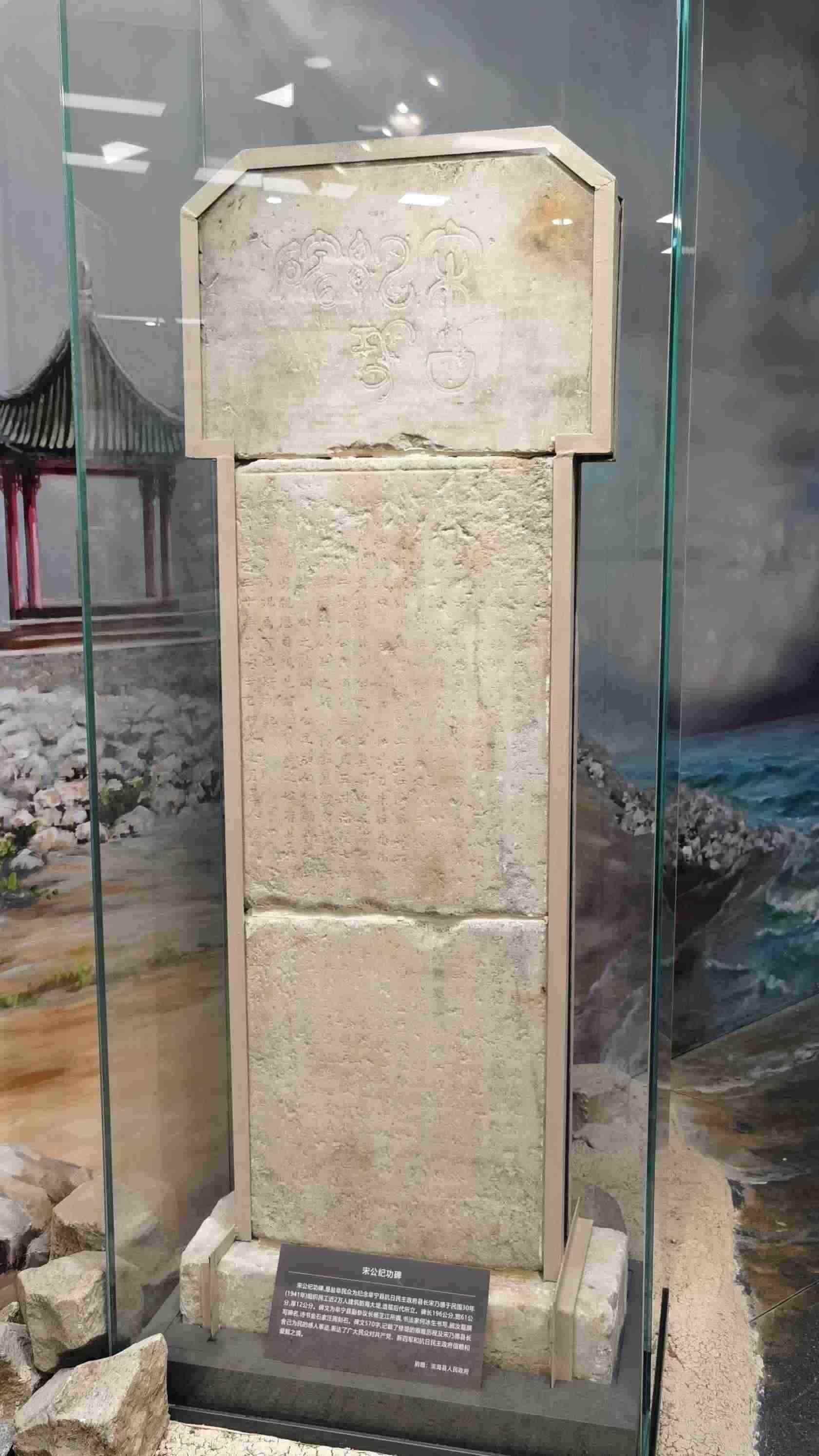 △新四軍紀(jì)念館里的宋公紀(jì)功碑。此碑是鹽阜民眾為紀(jì)念阜寧縣抗日民主政府縣長(zhǎng)宋乃德于1941年組織修筑海防大堤所立。碑文記載了修筑大堤的艱難歷程,表達(dá)了鹽阜民眾對(duì)共產(chǎn)黨、新四軍和抗日民主政府的信賴和愛(ài)戴之情。(總臺(tái)央視記者郭鴻拍攝)