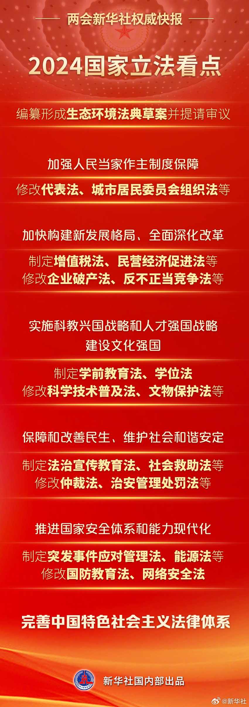 8日提請十四屆全國人大二次會(huì)議審議的全國人大常委會(huì)工作報(bào)告提出,2024年,要認(rèn)真落實(shí)常委會(huì)立法規(guī)劃,完善中國特色社會(huì)主義法律體系:制定民營經(jīng)濟(jì)促進(jìn)法、學(xué)前教育法、社會(huì)救助法等,修改城市居民委員會(huì)組織法、文物保護(hù)法、網(wǎng)絡(luò)安全法等。
