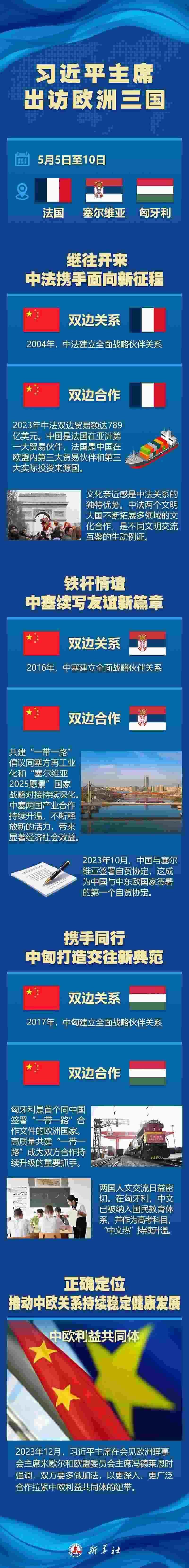 應(yīng)法蘭西共和國(guó)總統(tǒng)馬克龍、塞爾維亞共和國(guó)總統(tǒng)武契奇、匈牙利總統(tǒng)舒尤克和總理歐爾班邀請(qǐng),國(guó)家主席習(xí)近平將于5月5日至10日對(duì)上述三國(guó)進(jìn)行國(guó)事訪問(wèn)。訪問(wèn)期間,習(xí)近平主席將同法國(guó)、塞爾維亞、匈牙利領(lǐng)導(dǎo)人為雙邊關(guān)系、中歐關(guān)系健康發(fā)展指引方向,為拓展深化互利合作注入動(dòng)力。一起來(lái)看↓↓↓