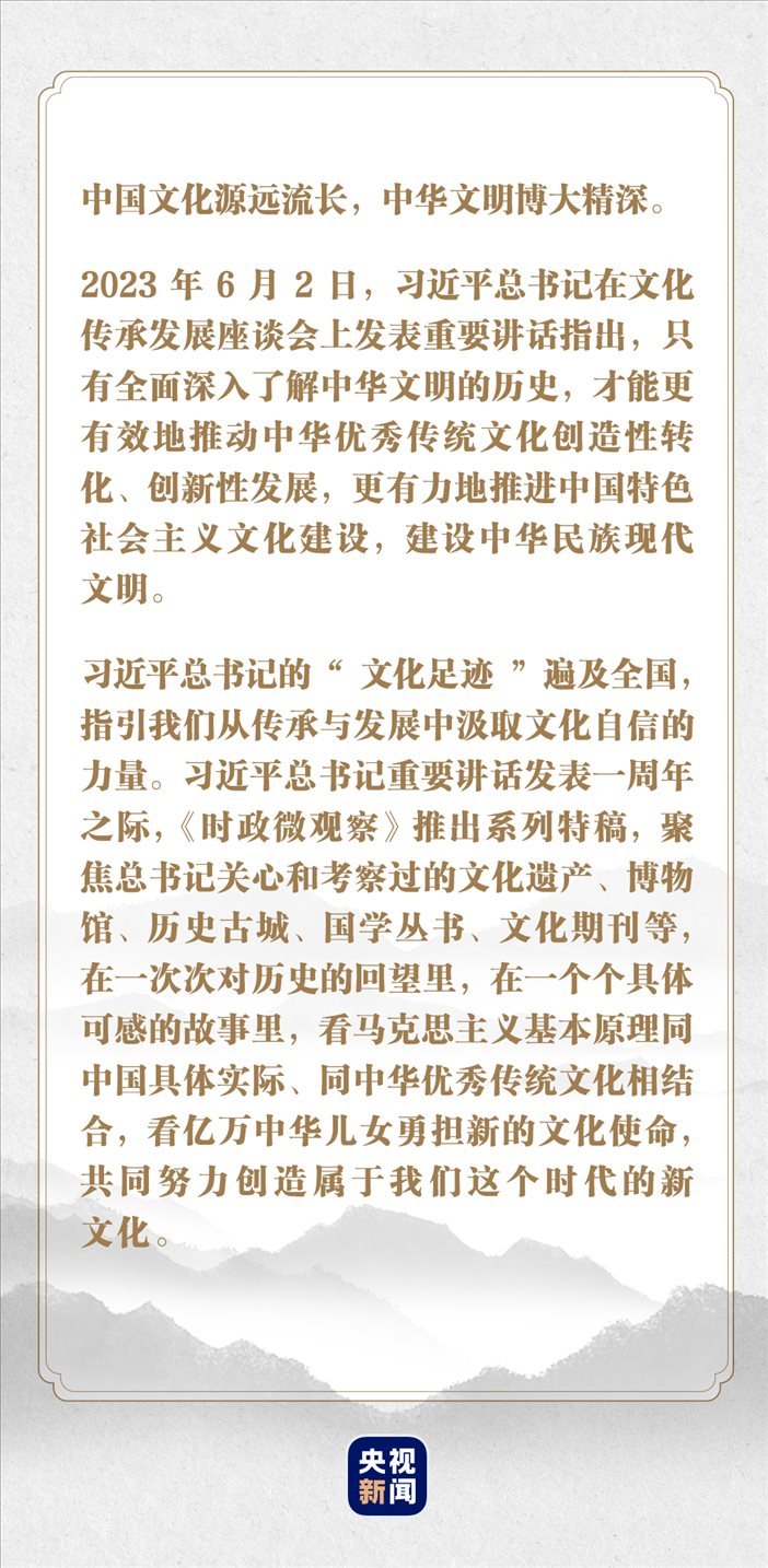 而今,我們起而行之,全面深入了解中華文明的歷史,推動中華優(yōu)秀傳統(tǒng)文化創(chuàng)造性轉(zhuǎn)化、創(chuàng)新性發(fā)展,擔(dān)負(fù)起新的文化使命。