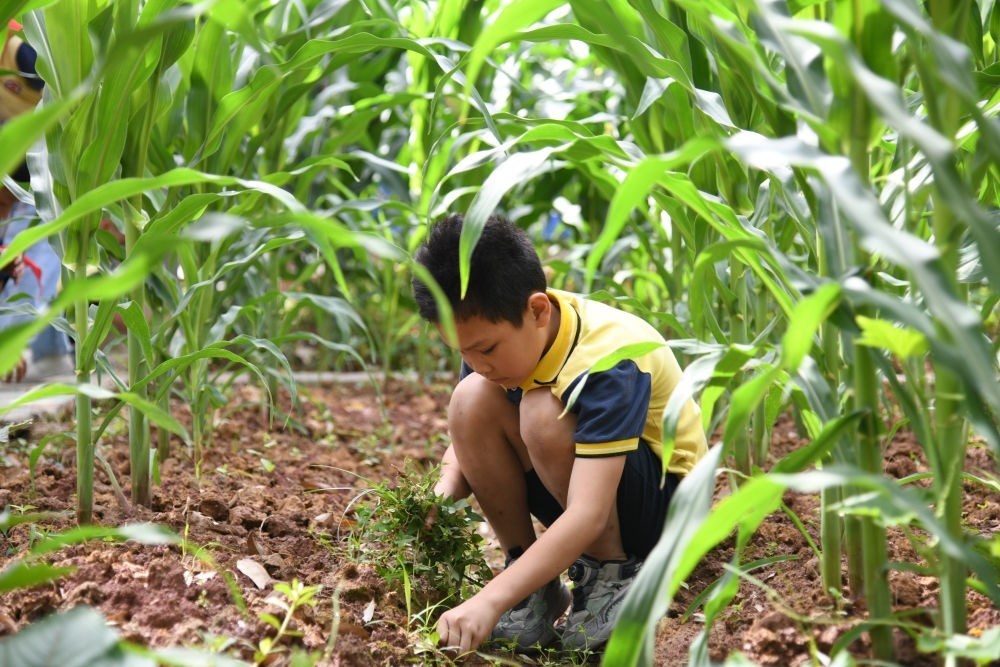 5月31日,學(xué)生在之江小學(xué)勞動實(shí)踐基地除草。