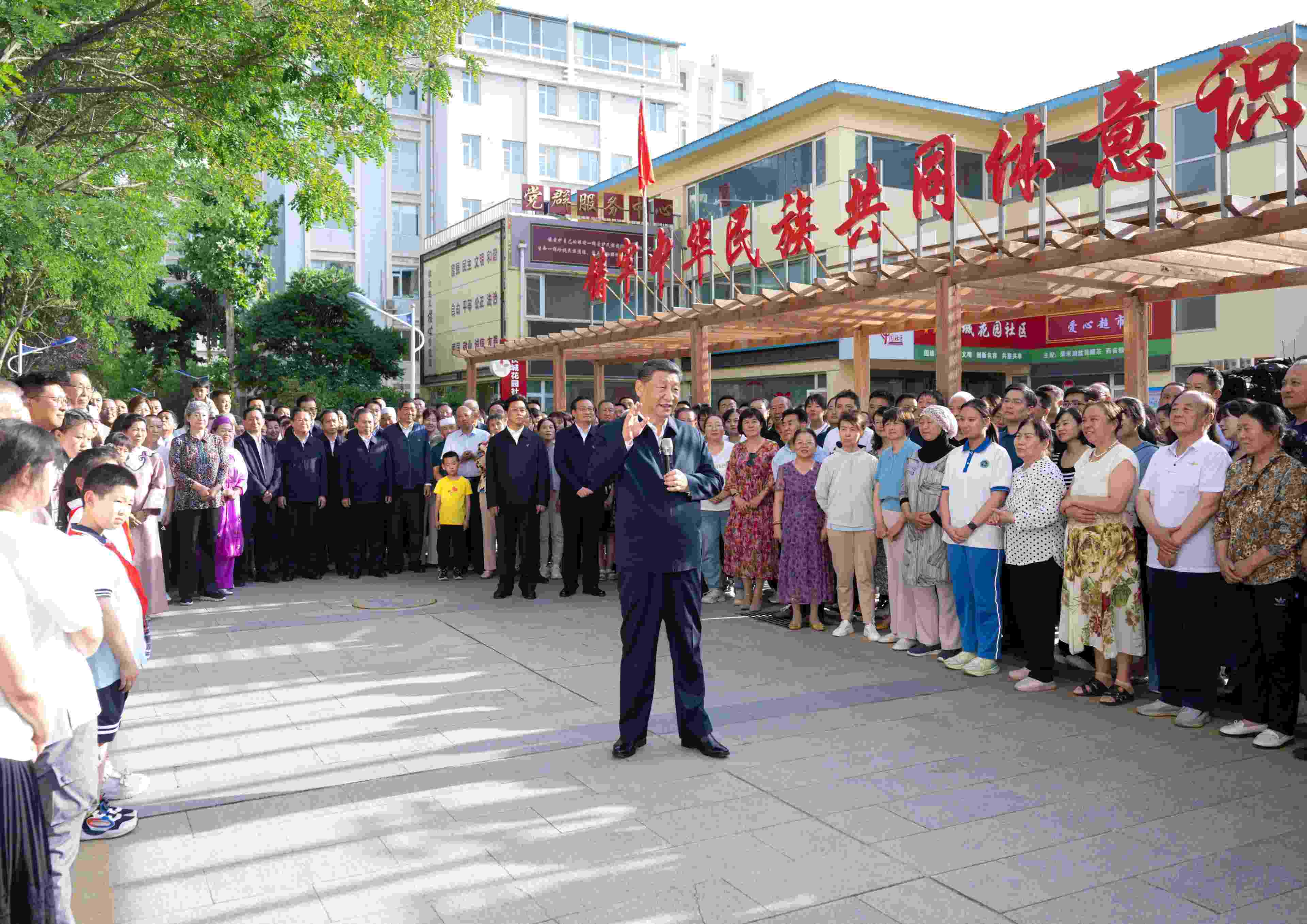 19日下午,習(xí)近平總書記來到寧夏銀川市金鳳區(qū)長城花園社區(qū)考察??吹竭@個多民族聚居的社區(qū)其樂融融,各族群眾和睦相處、生活幸福,習(xí)近平十分高興。他說,民族團結(jié)非常重要,我們五十六個民族要像石榴籽一樣緊緊抱在一起。五十六個民族凝聚在一起就是中華民族共同體,中華民族是一個大家庭。我們共同奮斗,一起推進中國式現(xiàn)代化,實現(xiàn)中華民族偉大復(fù)興?。ǘ派袧桑?/p>