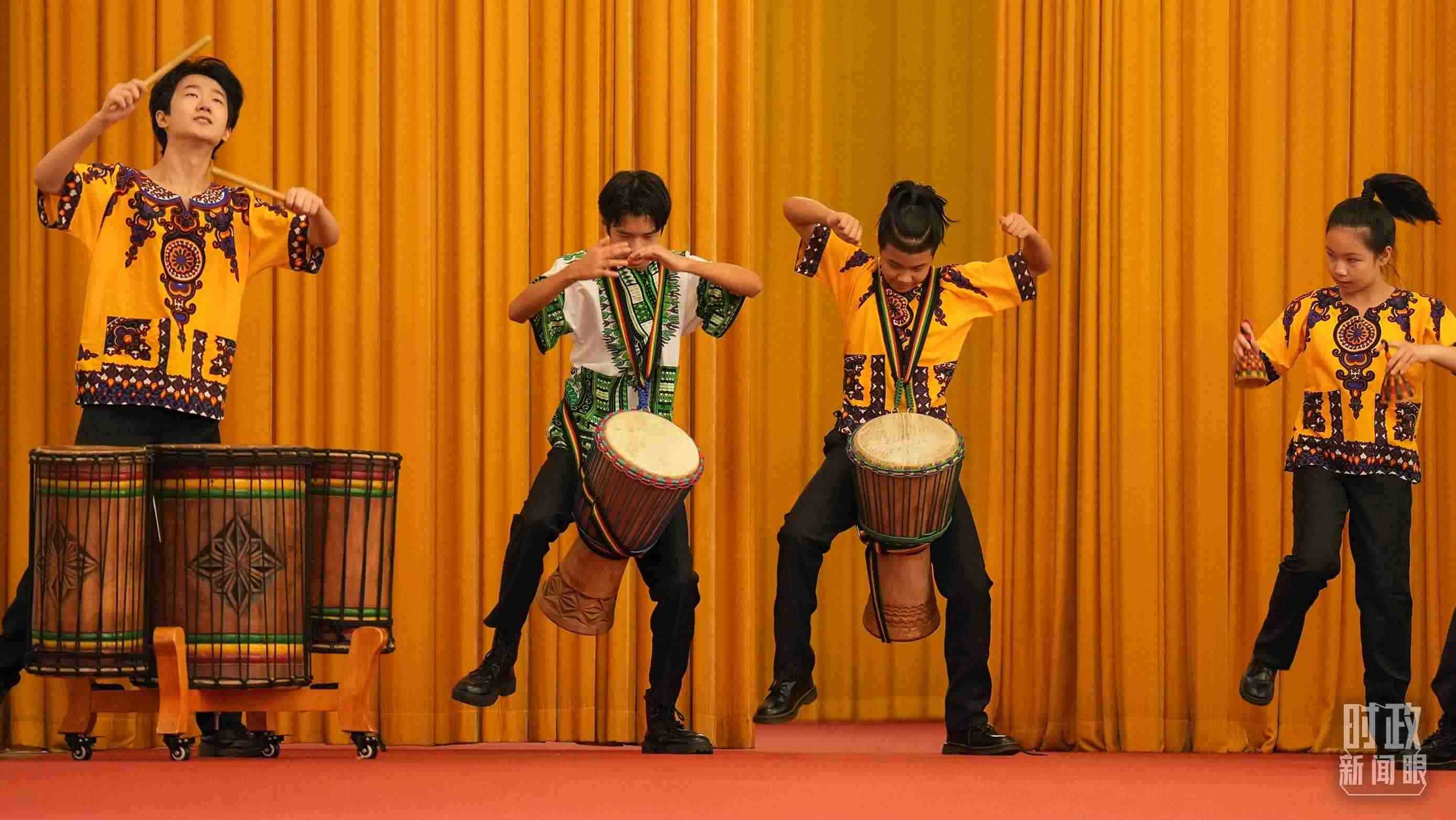 △中國少年打起歡快的非洲鼓。(總臺記者李晉拍攝)