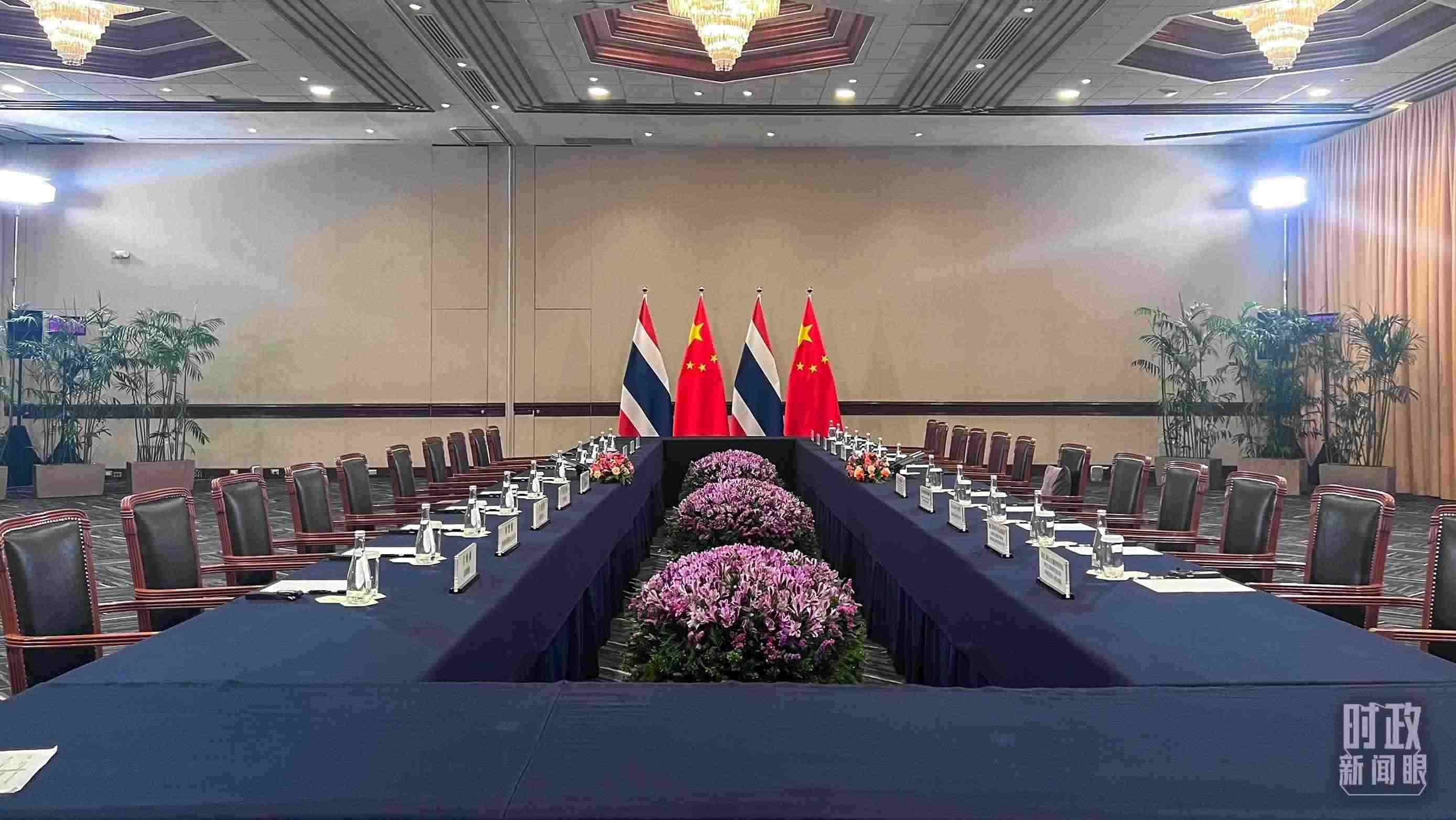 △會(huì)見現(xiàn)場的中泰兩國國旗。(總臺(tái)央視記者范一鳴拍攝)