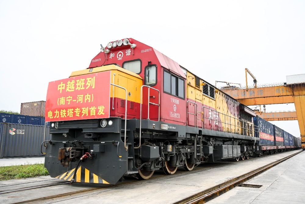 2024年3月8日,在廣西南寧國際鐵路港,電力鐵塔專列準備發(fā)車。當日,一列滿載340噸電力鐵塔的中越班列從南寧國際鐵路港開出,發(fā)往越南河內。新華社記者 曹祎銘 攝
