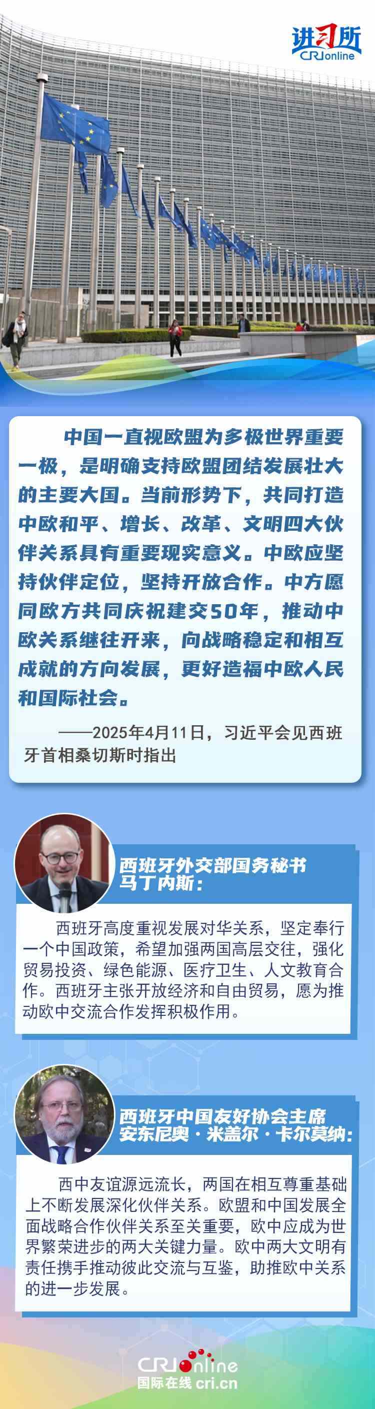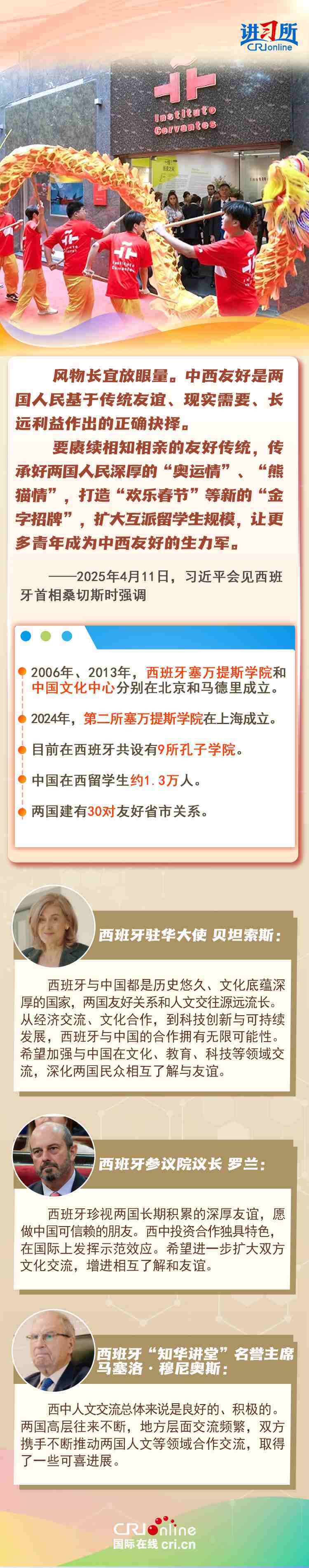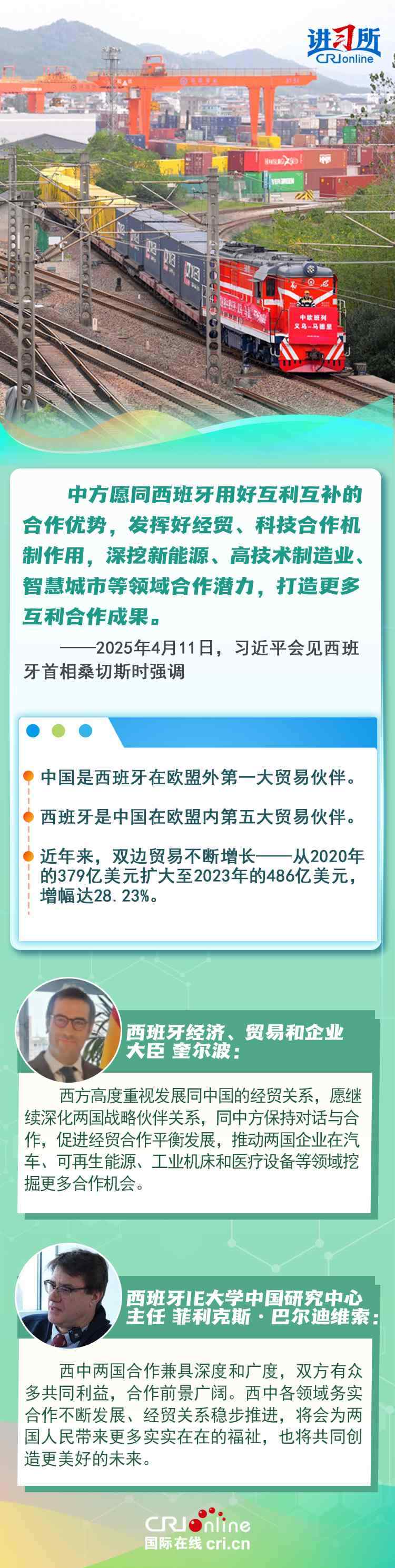 今年是中西全面戰(zhàn)略伙伴關(guān)系建立20周年,也是中歐建交50周年。多年來,中西兩國領(lǐng)導(dǎo)人保持密切互動,秉持互尊互信、互利共贏精神,兩國在深化貿(mào)易、投資、科技創(chuàng)新、綠色能源等領(lǐng)域取得豐富合作成果,雙邊關(guān)系走在中國同歐洲國家關(guān)系前列。在西班牙人士眼中,良好的對華關(guān)系對西班牙、歐洲和世界具有重要意義,將會為兩國人民帶來更多實(shí)實(shí)在在的福祉,也將共同創(chuàng)造更美好的未來。