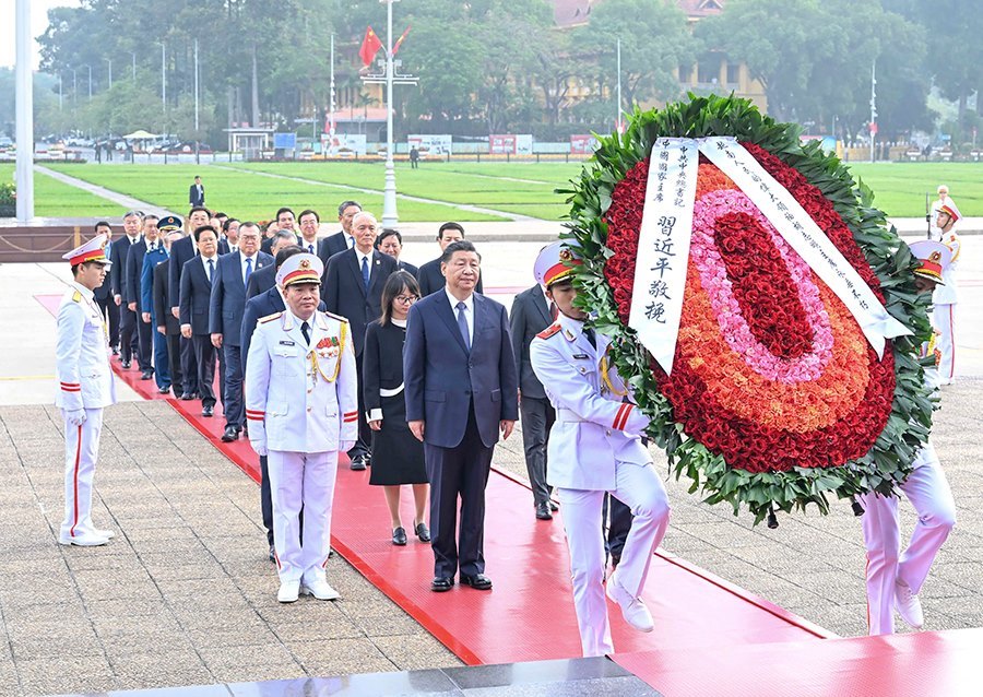 2023年,習(xí)近平總書記在訪越期間來到巴亭廣場,沿著載有無數(shù)歷史印記的石板路,前往胡志明陵敬獻(xiàn)花圈,追思緬懷。