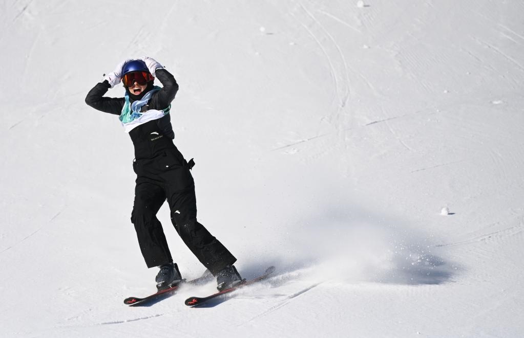 馭雪而馳、躍向藍(lán)天、翻轉(zhuǎn)兩周、轉(zhuǎn)體1620……3秒鐘后,穩(wěn)穩(wěn)落地,雪板激起的雪沫劃破全場(chǎng)緊張的寂靜,中國(guó)選手谷愛凌大聲尖叫,雙手抱頭,掩面而泣。2003年出生的她,用從未做出的超高難度動(dòng)作成功挑戰(zhàn)第三跳,上演超級(jí)大逆轉(zhuǎn),在8日舉行的北京冬奧會(huì)自由式滑雪女子大跳臺(tái)決賽中摘得桂冠?! ?/p>