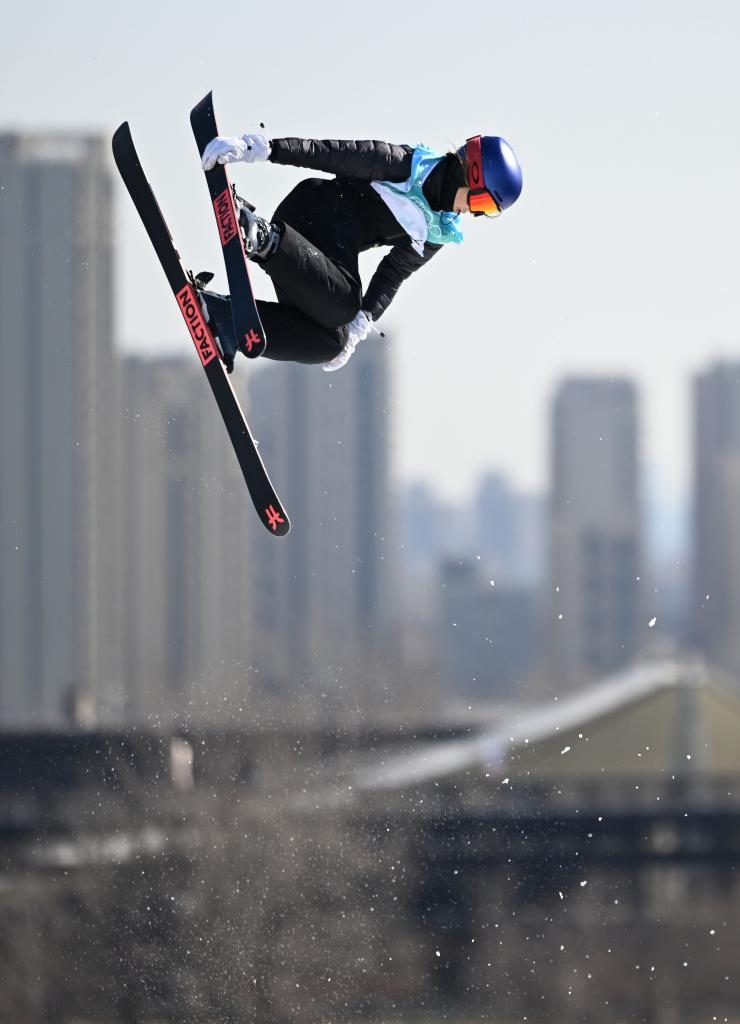2月8日,中國選手谷愛凌在北京2022年冬奧會自由式滑雪女子大跳臺決賽中。新華社記者李尕攝