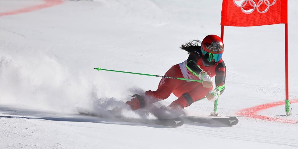 2月20日,中國隊(duì)選手孔凡影在北京冬奧會高山滑雪混合團(tuán)體項(xiàng)目比賽中。新華社記者陳斌攝