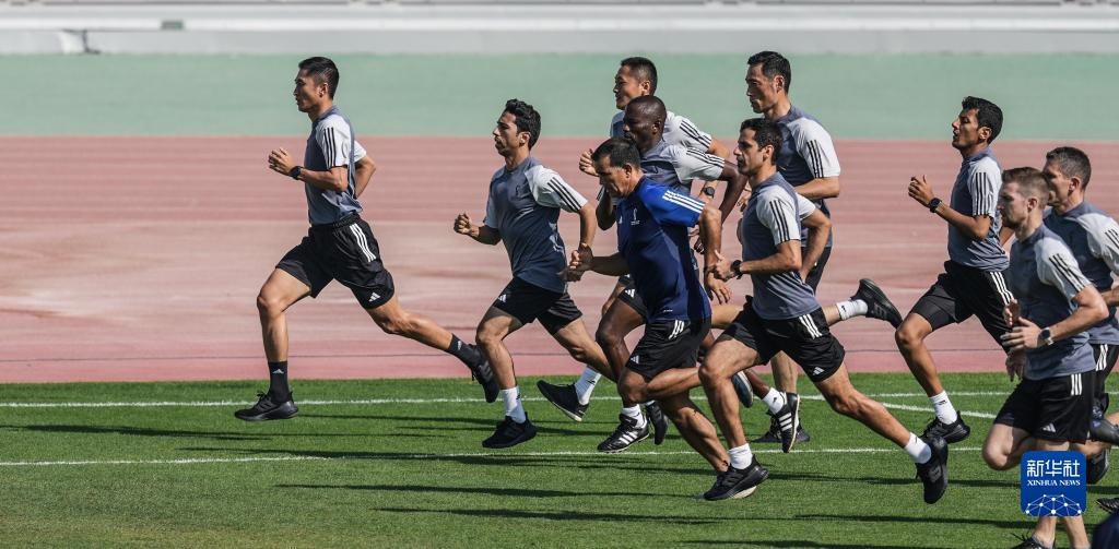 當日,入選2022年卡塔爾世界杯裁判員名單的中國裁判馬寧、曹奕與施翔在卡塔爾體育俱樂部球場進行訓練。
