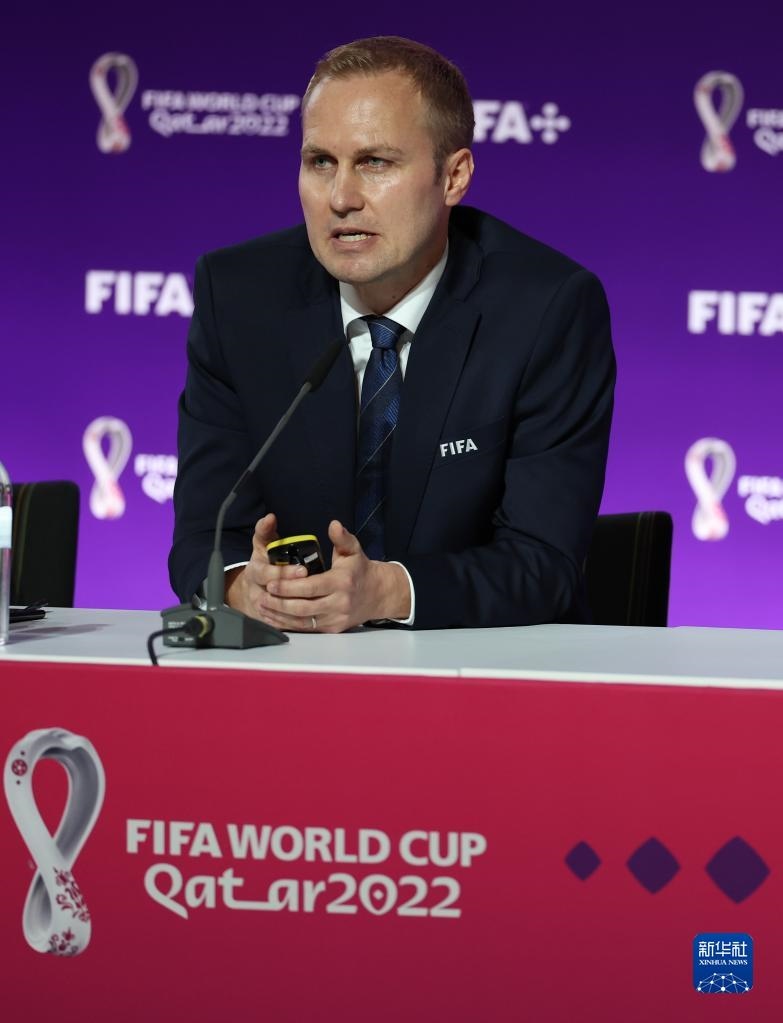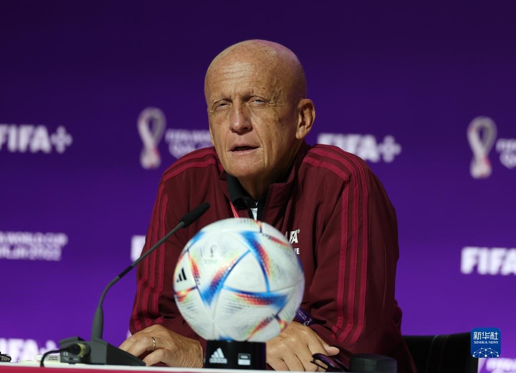 11月18日,國際足聯(lián)裁判委員會主席皮耶路易吉·科利納在通氣會上。新華社記者 賈浩成 攝