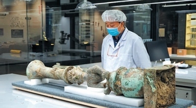 數(shù)字采集考古人員在實(shí)驗(yàn)室,對三星堆出土文物進(jìn)行高光譜掃描。廣漢市委宣傳部供圖
