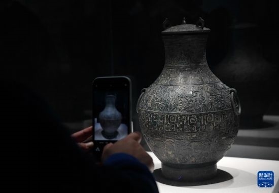 10月25日,觀眾在秦始皇帝陵博物院觀看成都博物館館藏文物狩獵紋銅壺。