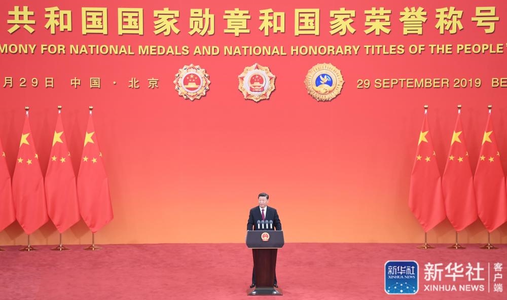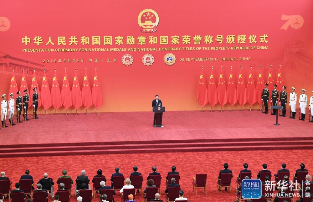 ↑9月29日,中華人民共和國(guó)國(guó)家勛章和國(guó)家榮譽(yù)稱(chēng)號(hào)頒授儀式在北京人民大會(huì)堂金色大廳隆重舉行。中共中央總書(shū)記、國(guó)家主席、中央軍委主席習(xí)近平向國(guó)家勛章和國(guó)家榮譽(yù)稱(chēng)號(hào)獲得者頒授勛章獎(jiǎng)?wù)虏l(fā)表重要講話。新華社記者鞠鵬攝