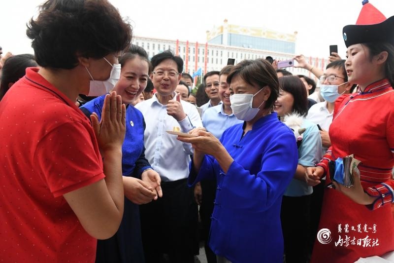 布小林認(rèn)真觀看精品旅游線(xiàn)路和重點(diǎn)景區(qū)、民族手工藝品、特色文創(chuàng)旅游商品、非物質(zhì)文化遺產(chǎn)、傳統(tǒng)技藝制作以及傳統(tǒng)蒙古包展示,了解文旅科技發(fā)展,并與相關(guān)人員交流商品的創(chuàng)意設(shè)計(jì)、制作工藝、市場(chǎng)銷(xiāo)售等情況,鼓勵(lì)他們保護(hù)傳承好民族手工藝、非物質(zhì)文化遺產(chǎn)和傳統(tǒng)技藝,注重將傳統(tǒng)工藝與現(xiàn)代技藝結(jié)合起來(lái),與現(xiàn)實(shí)生活和時(shí)尚需求結(jié)合起來(lái),使其具有更旺盛的生命力和更廣闊的市場(chǎng)。在內(nèi)蒙古味道展示區(qū),布小林仔細(xì)詢(xún)問(wèn)特色美食的制作和食材來(lái)源,并向現(xiàn)場(chǎng)群眾介紹內(nèi)蒙古農(nóng)畜產(chǎn)品。她說(shuō):“內(nèi)蒙古的農(nóng)畜產(chǎn)品是有機(jī)、綠色的,大家可以放心吃?!?/p>