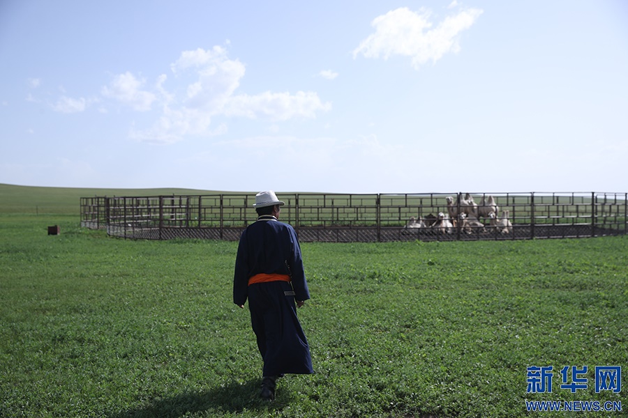 8月2日,其日麥拉圖在自家草場查看駱駝的喂養(yǎng)情況。新華網(wǎng)記者焦鵬攝