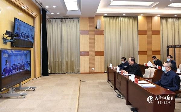10月24日,自治區(qū)黨委書記、人大常委會主任石泰峰來到自治區(qū)疫情防控工作指揮部與二連浩特市視頻連線,了解應對處置新冠肺炎疫情工作情況。內蒙古日報社融媒體記者袁永紅攝
