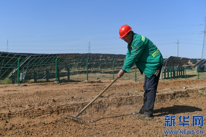 4月12日,郭軍在內(nèi)蒙古鄂爾多斯市布爾臺(tái)沉陷區(qū)的光伏板旁勞作。新華社記者 貝赫 攝