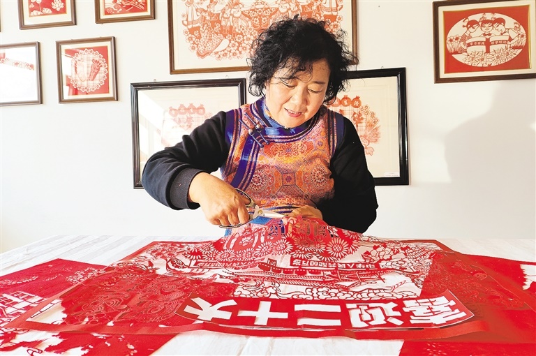 10月15日下午,自治區(qū)非遺剪紙項(xiàng)目傳承人、呼和浩特市土默特左旗畢克齊鎮(zhèn)紅秀剪紙合作社發(fā)起人李還秀在創(chuàng)作慶祝黨的二十大勝利召開系列剪紙作品。連日來(lái),全區(qū)各地群眾通過(guò)剪紙、書法等藝術(shù)形式,表達(dá)對(duì)盛會(huì)的期盼、對(duì)祖國(guó)的祝福。記者 鄭學(xué)良 實(shí)習(xí)生 郭亞麗 攝