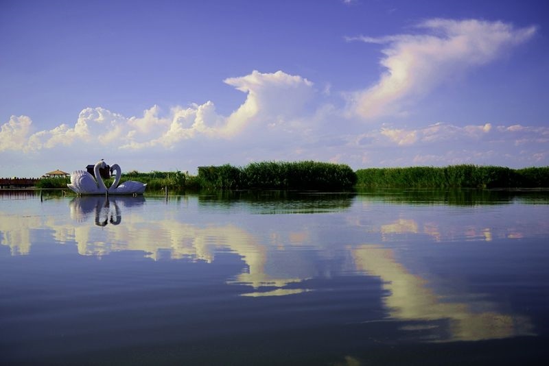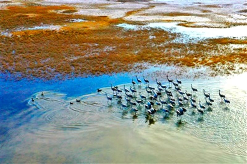 烏蘭布和沙漠境內(nèi)的天鵝湖濕地上候鳥飛翔
