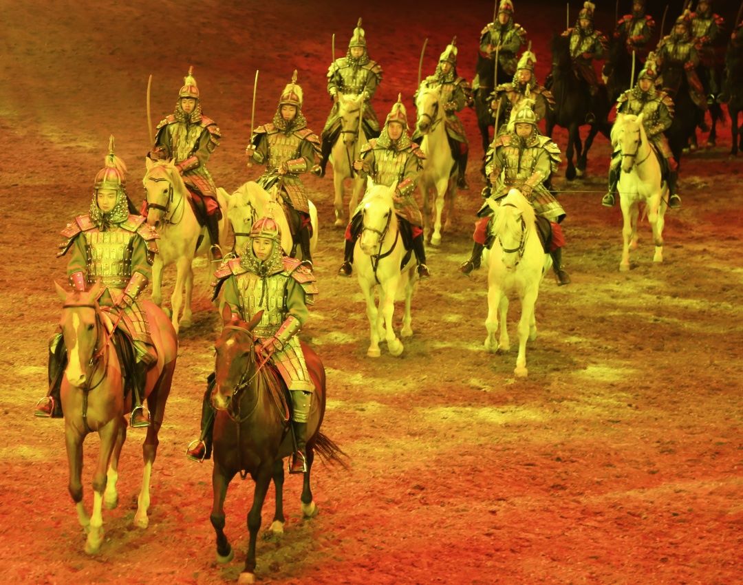 蒙古馬、汗血寶馬、盧西塔諾、弗里斯蘭、安達(dá)盧西亞、德保矮馬、阿拉伯馬等百余匹名馬、百名騎手組成龐大陣容的表演,整場(chǎng)演出恢宏震撼,充滿視覺沖擊力。