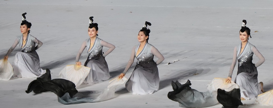 入場儀式結(jié)束后,在雄壯的國歌聲中,鮮艷的五星紅旗冉冉升起,在體育中心上空迎風(fēng)飄揚(yáng)。期盼的眼神,真摯的祝福,蕩漾在每個(gè)人的心間。開幕式文體展演隨后正式拉開帷幕。