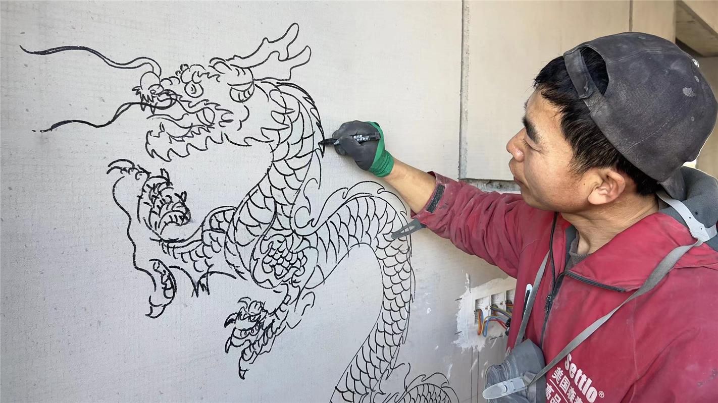 陳艷東在墻面上畫(huà)龍。