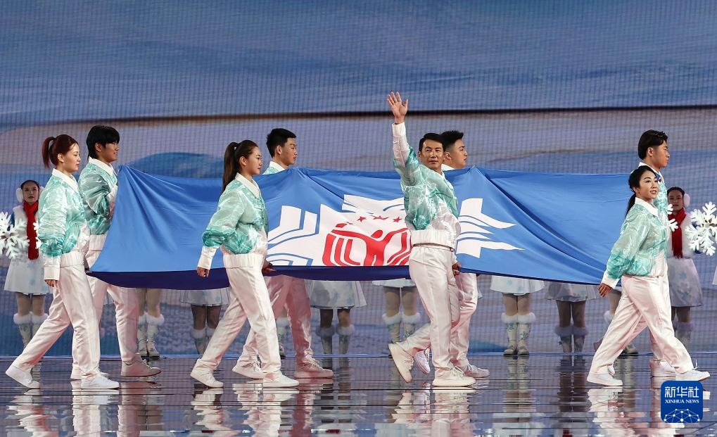 ??2月17日,中華人民共和國第十四屆冬季運動會會旗在開幕式上入場。新華社記者 楊晨光 攝