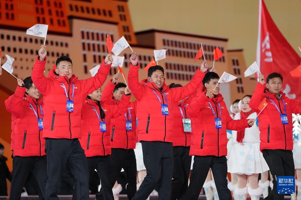 ??2月17日,中華人民共和國冬季運動會會旗執(zhí)旗手隋文靜(前左)在開幕式上入場。新華社記者 楊晨光 攝