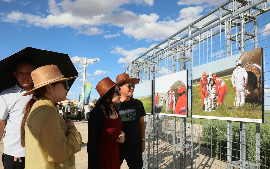 7月28日,第14屆《食色世界》攝影大展,在四子王旗格根塔拉草原旅游中心開展。圖為游客正在參觀攝影展。