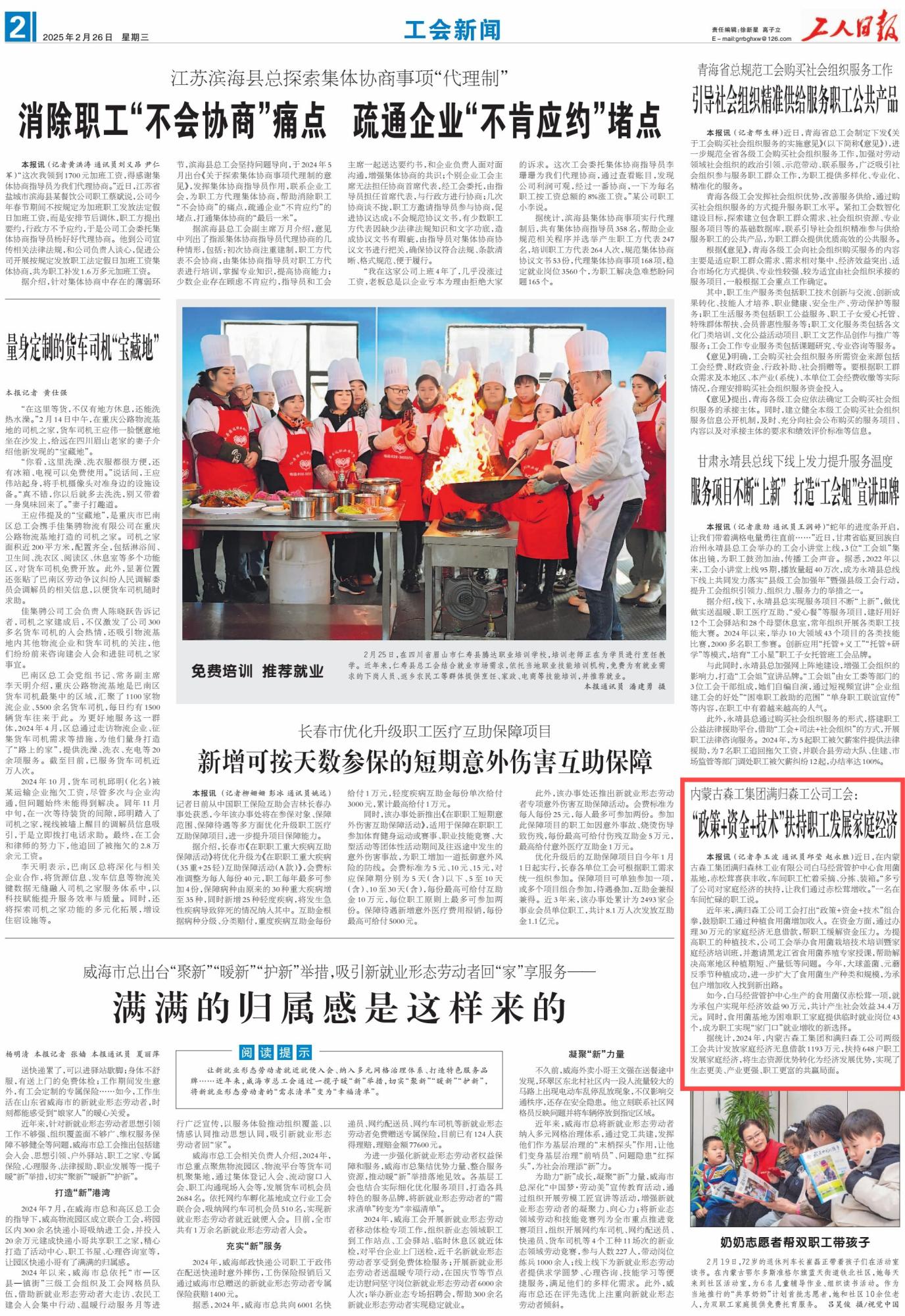 2025年2月26日,《工人日?qǐng)?bào)》第2版刊發(fā)題為《內(nèi)蒙古森工集團(tuán)滿歸森工公司工會(huì):“政策+資金+技術(shù)”扶持職工發(fā)展家庭經(jīng)濟(jì)》的消息,介紹了近年來,內(nèi)蒙古森工集團(tuán)滿歸森工公司工會(huì)打出“政策+資金+技術(shù)”組合拳,鼓勵(lì)職工通過種植食用菌增加收入。