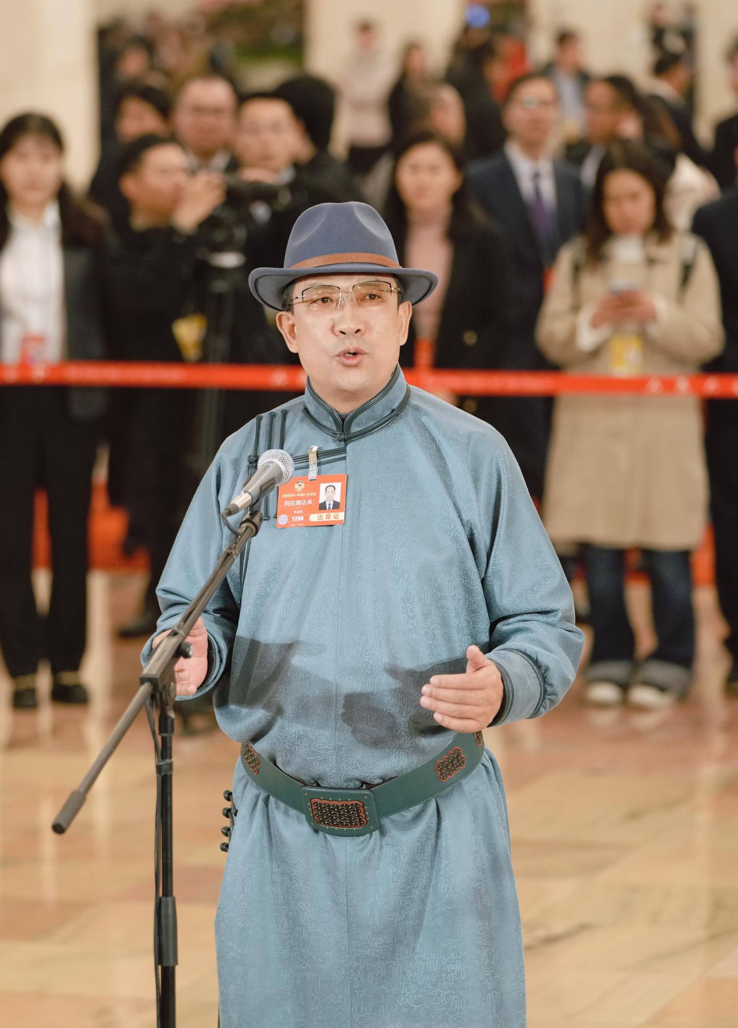 “大家好,我是全國政協(xié)委員、內(nèi)蒙古自治區(qū)錫林郭勒盟蘇尼特左旗烏蘭牧騎隊長阿拉騰達來?!?時15分許,住內(nèi)蒙古全國政協(xié)委員阿拉騰達來身著蒙古族服飾,走上“委員通道”,從容自信地向在場媒體記者作自我介紹。
