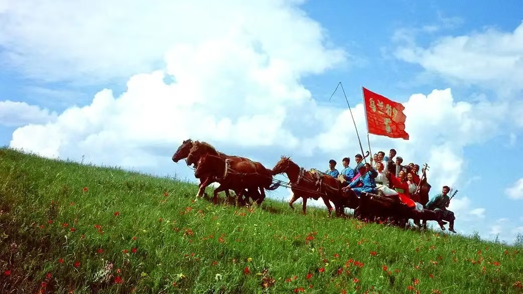 1957年6月17日,內蒙古第一支烏蘭牧騎在錫林郭勒盟蘇尼特右旗成立。成立第二天,9名隊員帶著兩塊幕布、三盞煤油燈、五件樂器,舉著紅旗,甩著響鞭,坐著馬車,向偏遠的牧區(qū)進發(fā)。