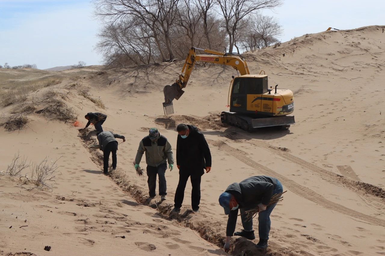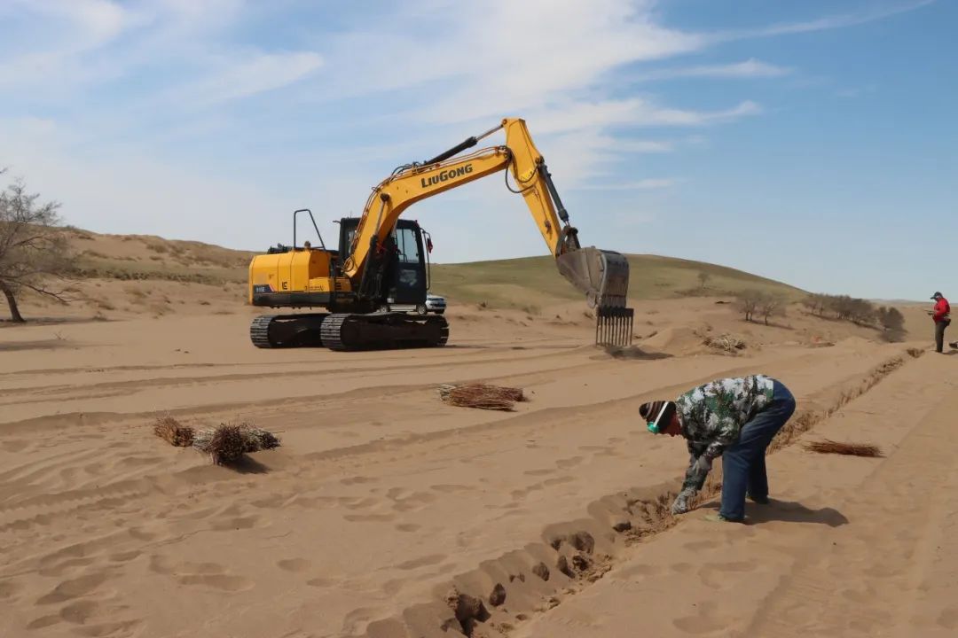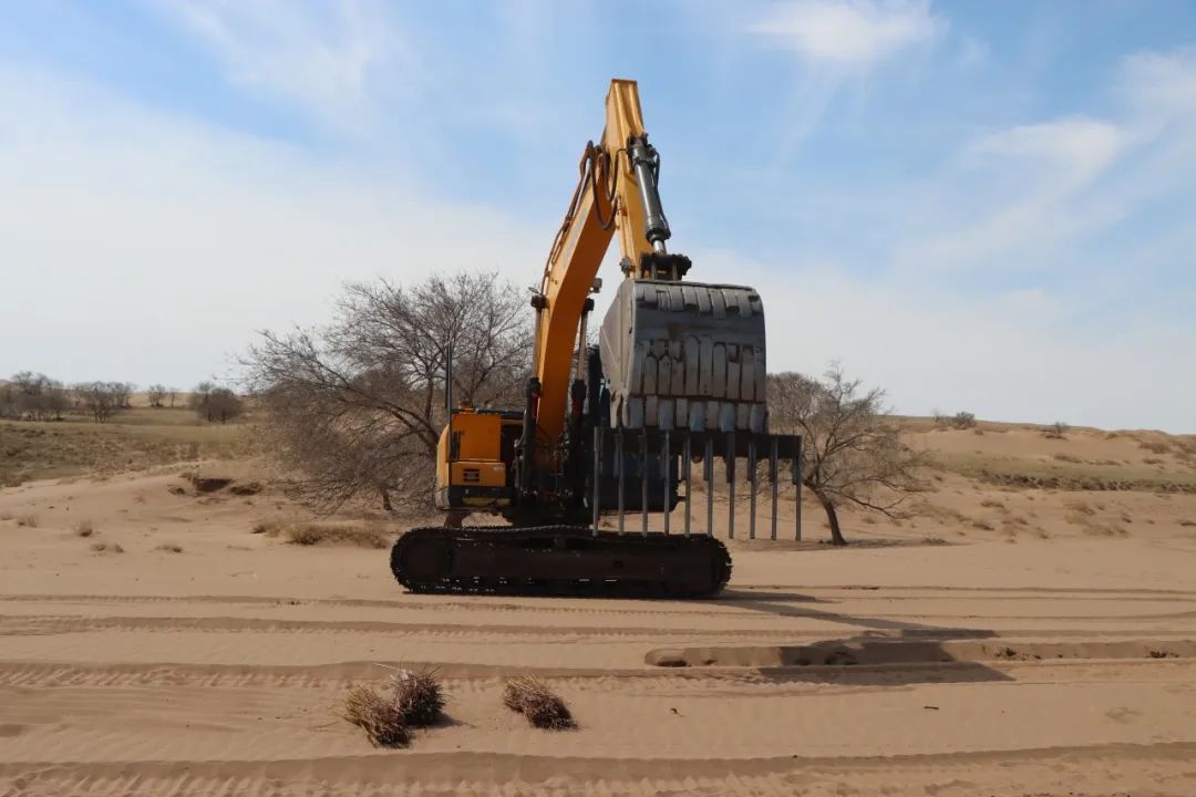 據(jù)錫林浩特市二蛋牧民養(yǎng)殖專業(yè)合作社負(fù)責(zé)人介紹,在傳統(tǒng)的沙漠治理作業(yè)中,工人需要手動(dòng)栽植黃柳等固沙植物。然而,人工種植不僅效率低,勞動(dòng)強(qiáng)度也大。為突破這一困境,合作社成員經(jīng)過(guò)多次試驗(yàn),最終決定對(duì)挖掘機(jī)進(jìn)行創(chuàng)新改造,加裝叉具,這一巧妙的設(shè)計(jì)不僅實(shí)現(xiàn)了對(duì)黃柳種植深度和間距的精準(zhǔn)把控,還能有效避免土壤翻動(dòng),最大程度地保持了土壤水分,切實(shí)保護(hù)了沙地的生態(tài)環(huán)境。