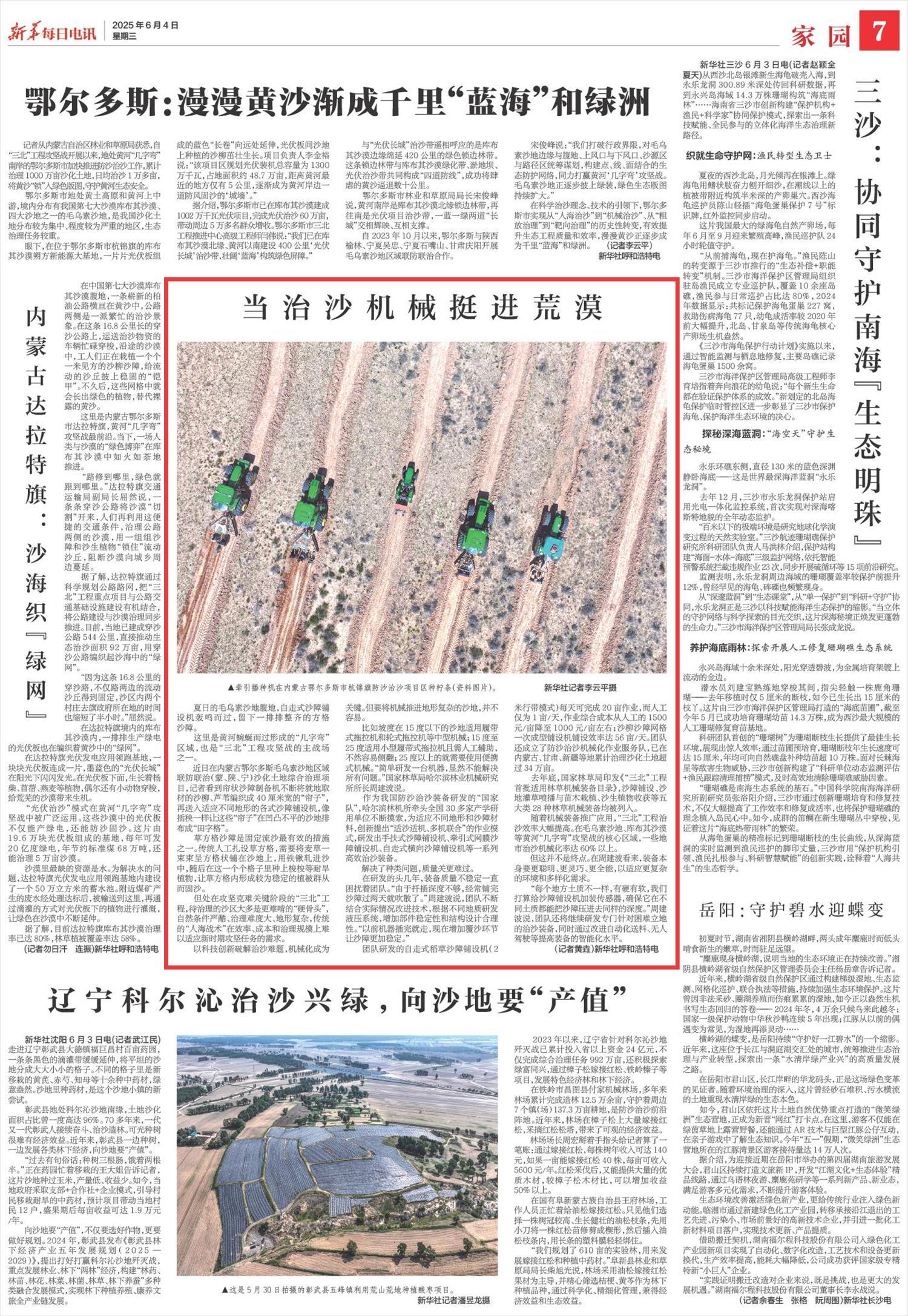 2025年6月4日,《新華每日電訊》第7版刊發(fā)題為《當(dāng)治沙機(jī)械挺進(jìn)荒漠》一文,報(bào)道了內(nèi)蒙古鄂爾多斯毛烏素沙地區(qū)域聯(lián)防聯(lián)治(蒙、陜、寧)沙化土地綜合治理項(xiàng)目創(chuàng)新應(yīng)用系列機(jī)械化沙障鋪設(shè)裝備,適應(yīng)復(fù)雜地形,“三北”工程治沙效率大幅提高。毛烏素沙地、庫(kù)布其沙漠等黃河“幾字彎”攻堅(jiān)戰(zhàn)的核心區(qū)域,一些地市治沙機(jī)械化率達(dá)60%以上。