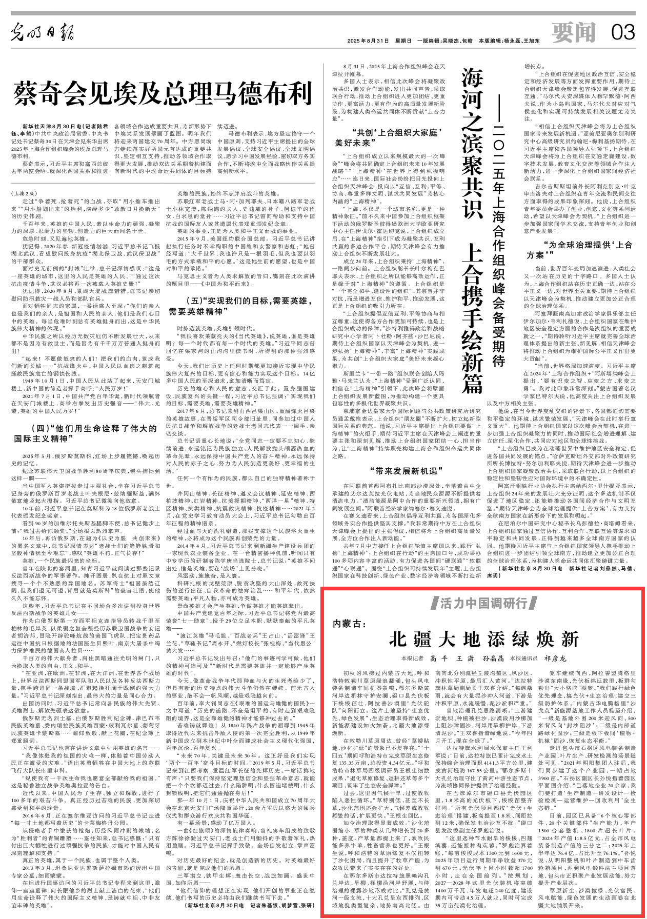 2025年8月31日,《光明日報》第3版刊發(fā)題為《內(nèi)蒙古:北疆大地添綠煥新》的文章,報道了內(nèi)蒙古堅持“生態(tài)優(yōu)先、綠色發(fā)展”,生態(tài)治理取得新成效,新能源建設(shè)如火如荼,北疆大地添綠煥新。