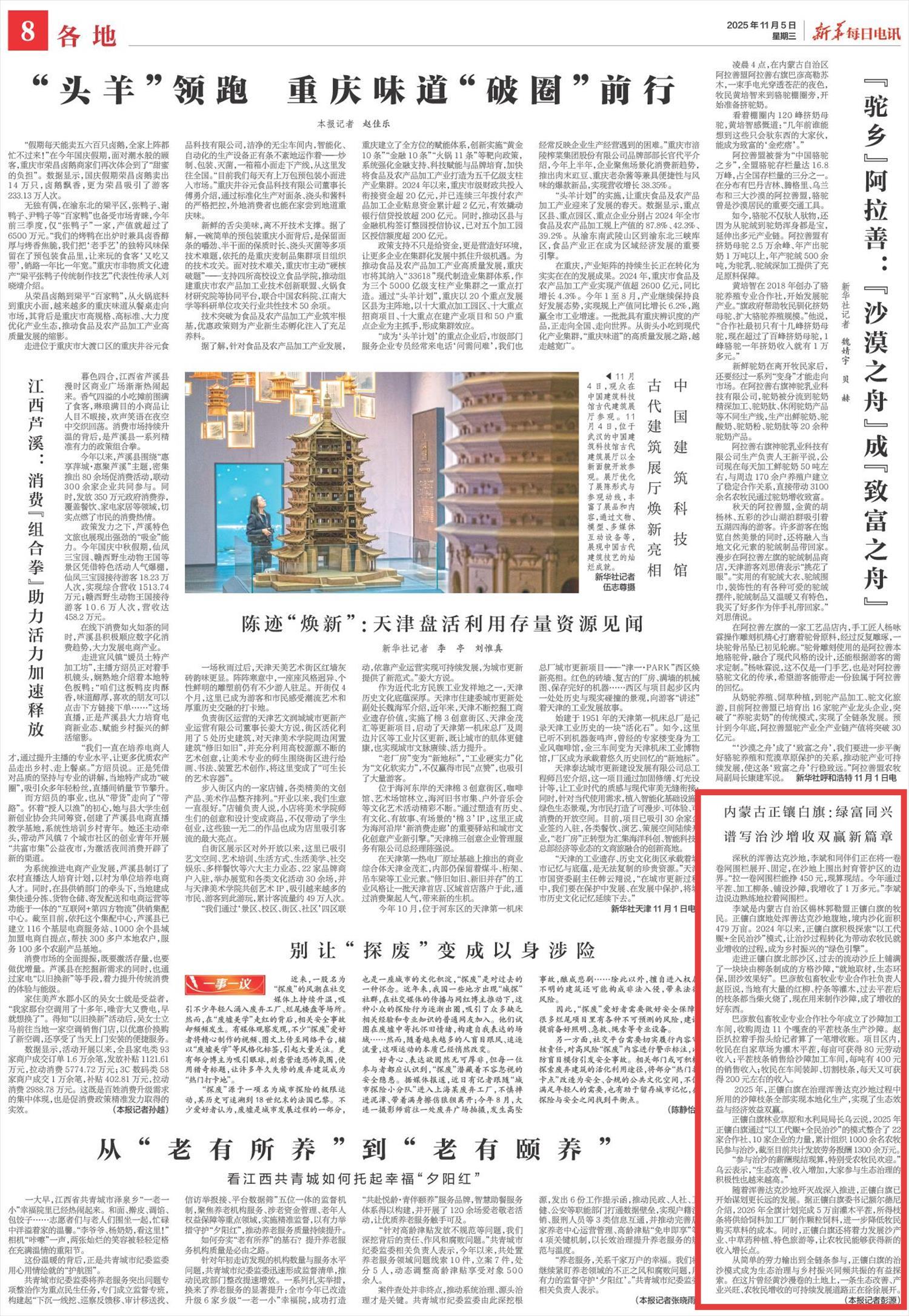 2025年11月5日,《新華每日電訊》第8版刊發(fā)題為《內(nèi)蒙古正鑲白旗:綠富同興譜寫治沙增收雙贏新篇章》的文章,報(bào)道了2024年以來(lái),內(nèi)蒙古正鑲白旗積極探索“以工代賑+全民治沙”模式,讓治沙過(guò)程轉(zhuǎn)化為帶動(dòng)農(nóng)牧民就業(yè)增收的過(guò)程,成為鄉(xiāng)村振興的“綠色引擎”。