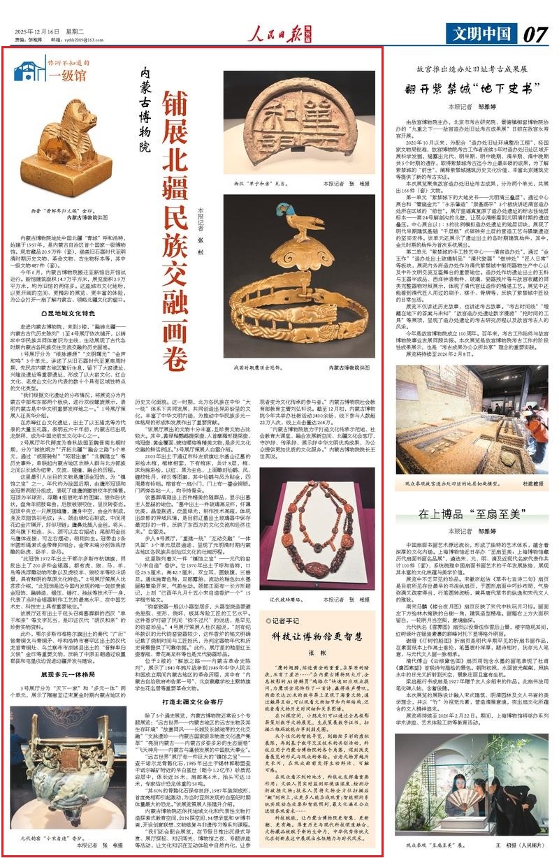 12月16日,《人民日?qǐng)?bào)海外版》刊發(fā)《內(nèi)蒙古博物院 鋪展北疆民族交融畫卷》,報(bào)道內(nèi)蒙古自治區(qū)首個(gè)國家一級(jí)博物館今年6月搬遷至新館后開館試運(yùn)行。新館建筑面積14.7萬平方米,展覽面積3.9萬平方米,均為舊館的兩倍多。這座城市文化地標(biāo),以更開闊的空間、更精彩的展覽、更豐富的體驗(yàn),為公眾打開一扇了解內(nèi)蒙古、領(lǐng)略北疆文化的窗口。